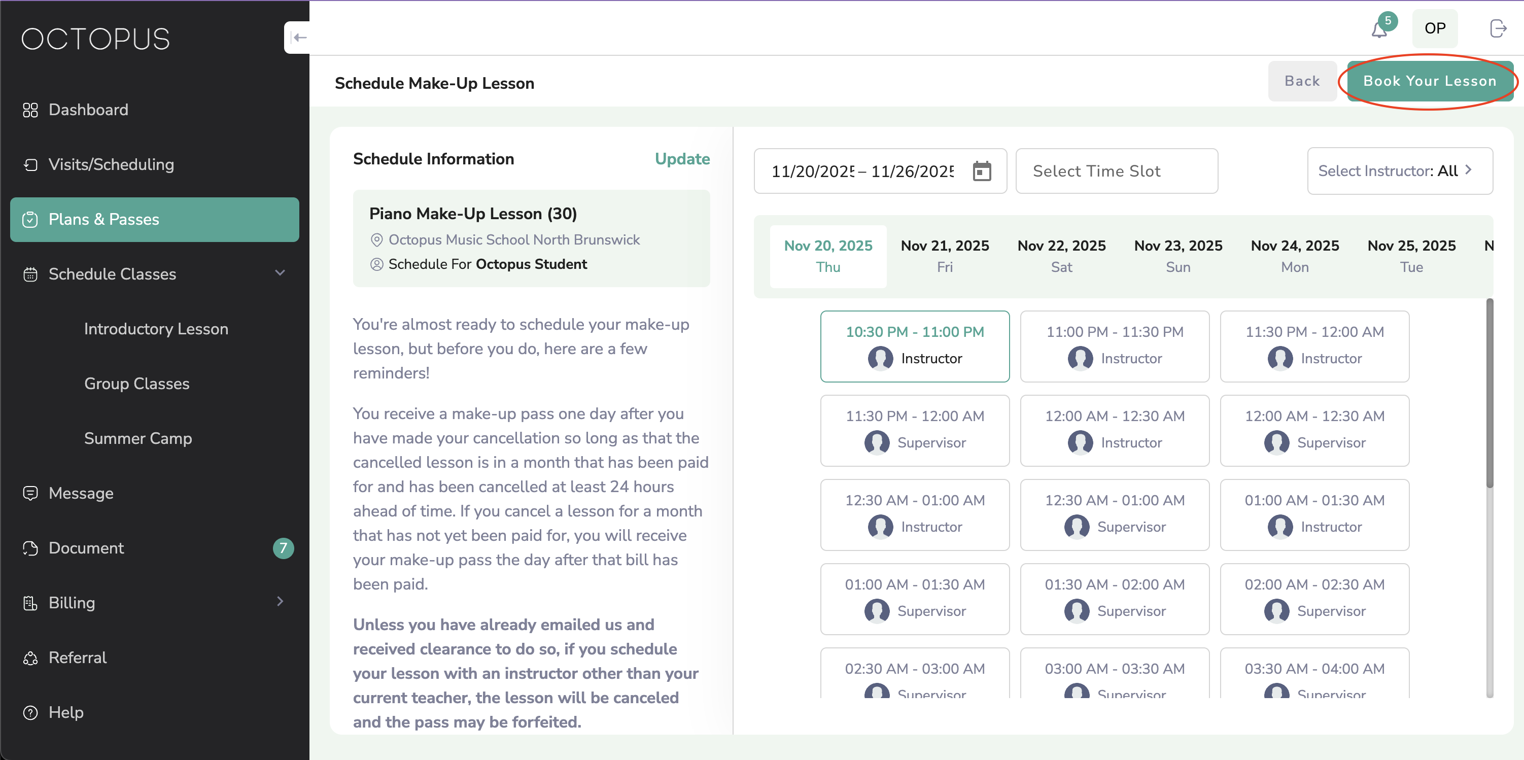 STOP: Please only select the instructor the original lesson was scheduled with (unless you have already been cleared to schedule with another instructor by a support staff member). Unless given permission by your instructor to do so, please do not book your make-up back-to-back with your regularly scheduled weekly lesson.